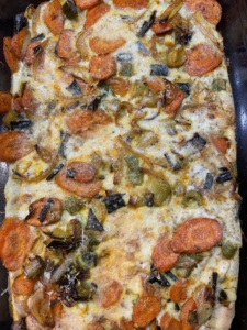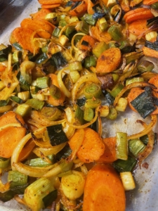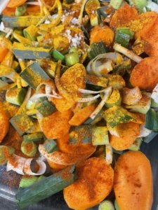 - Assaisonnement des légumes : 4 CAS D’huile – 1 cc de curcuma – cumin – paprika – fleur de sel – poivre