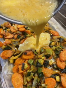 Lorsque les 25 minutes sont écoulées, sortir le plat du four et verser l’omelette sur les légumes. Râper le comté. Enfourner pour 15 minutes supplémentaires.