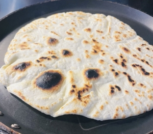 Cuire dans une poêle à crêpe très chaude (qui “fume”). Baisser le feu ensuite (laisser fort tout de même). Lorsque des bulles apparaissent à la surface, retourner et cuire 30 secondes à 1 minute en plus. Déposer dans une assiette et réserver (sous un linge humide). Attention le wrap ne doit pas cuire longtemps ni noircir.
